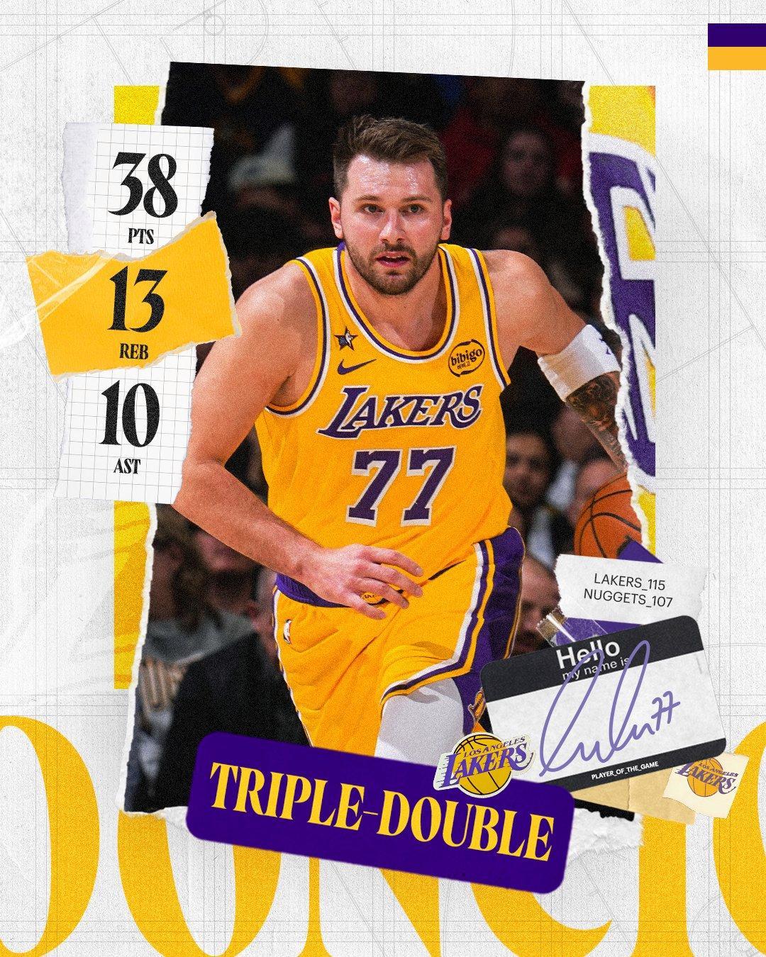 湖人队超级巨星卢卡东契奇,在此役打出了绝佳表现。东契奇上场35分钟,21中12,三分9中3,罚球12中11,狂砍38分13篮板10助攻2抢断的超级三双数据,正负值-2。东契奇以57%的命中率轰下了全场的最高分,他还有着91.7%的罚球命中率罚。作为此战走出罚球线次数最多的球员,东契奇展现了极强的侵略性和求胜欲望。首节砍下了16分的东契奇,在上半场贡献了23分。下半场,东契奇再得15分。第3节,东契奇独得9分,成为湖人追分的急先锋。末节,东契奇再得6分。