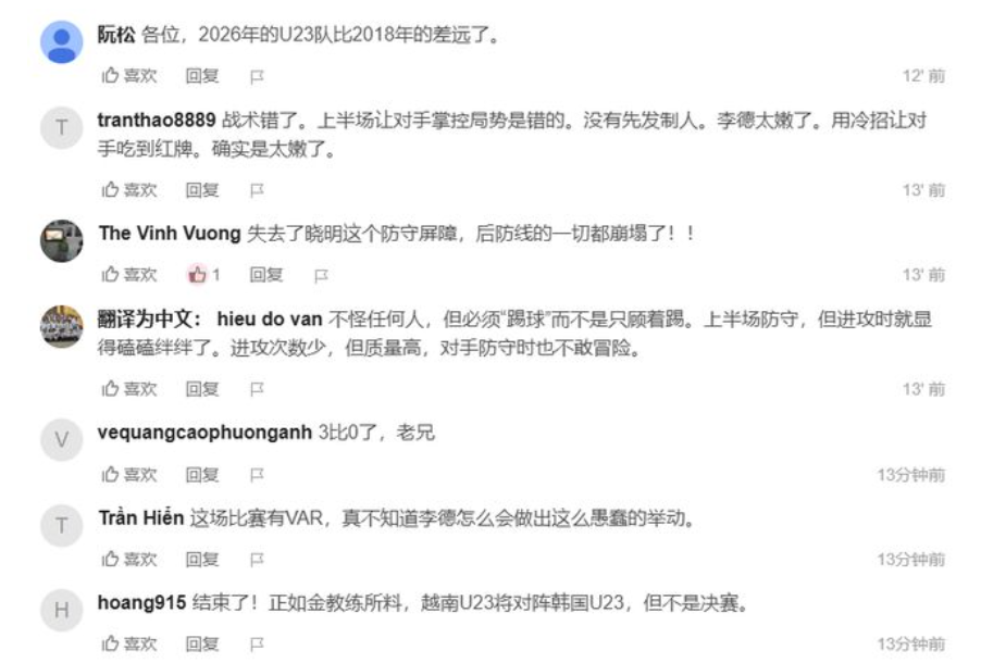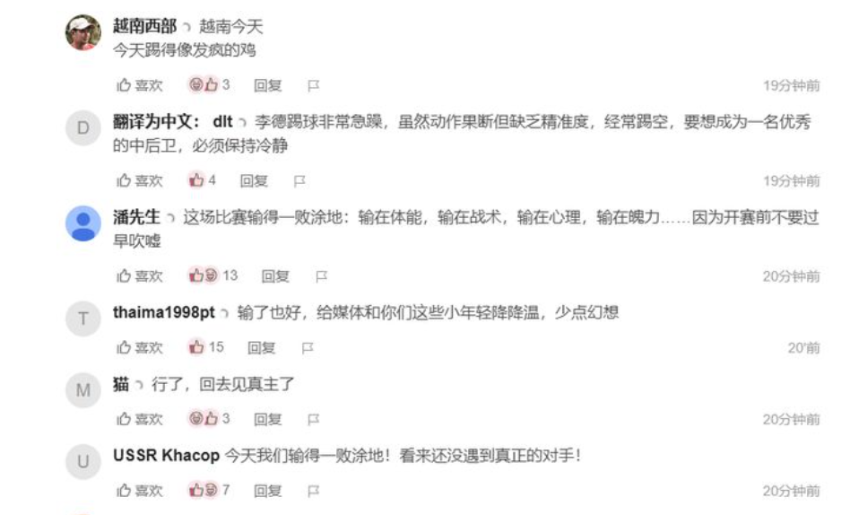 赛后,越南球迷纷纷在社媒直言,对本场比赛的结果相当失望,他们心碎说道:“真不敢相信越南队会踢成这样,太差了!”;“输得一塌糊涂!”;“输了也好,给这些年轻球员降降温!”