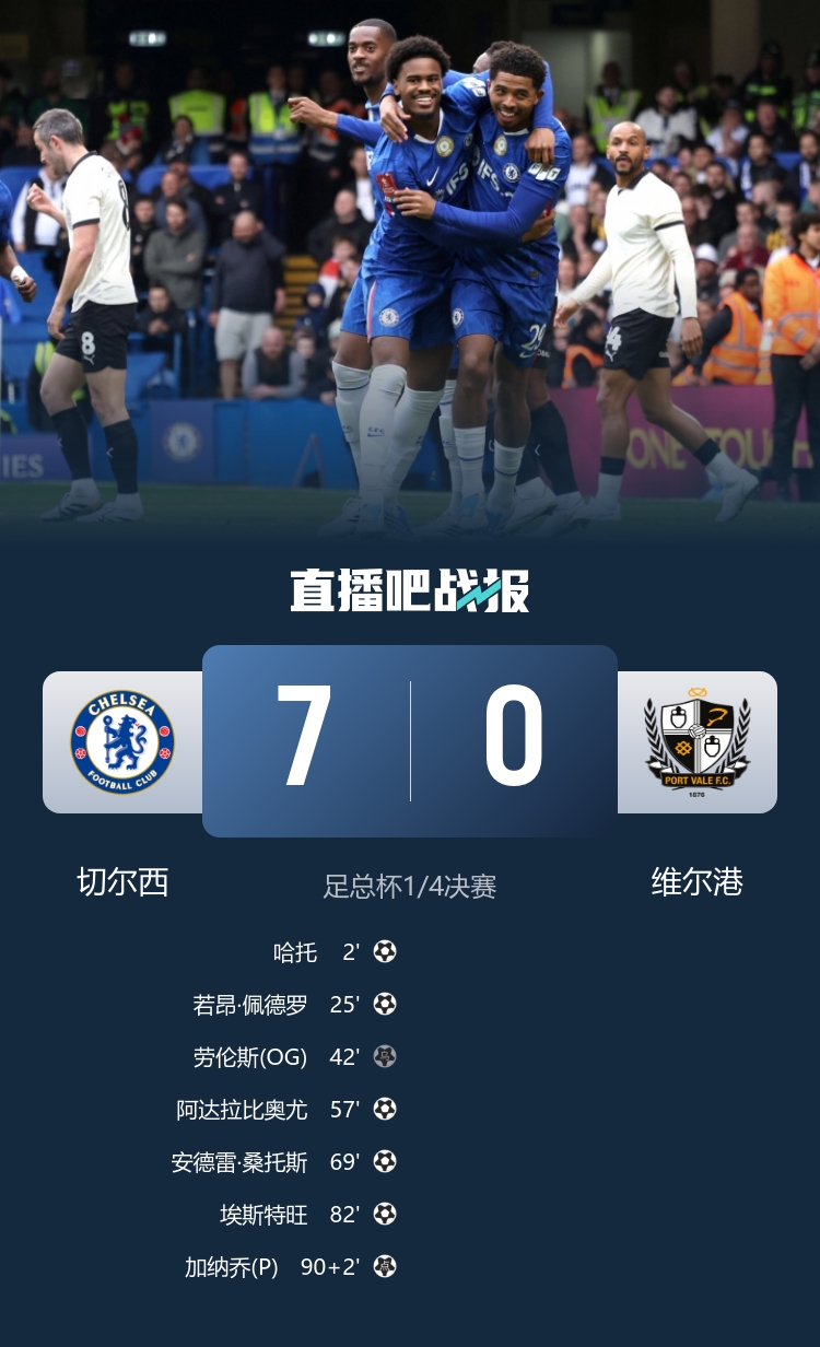 止4连败!切尔西7-0大胜维尔港进足总杯4强 埃斯特旺传射+两中柱