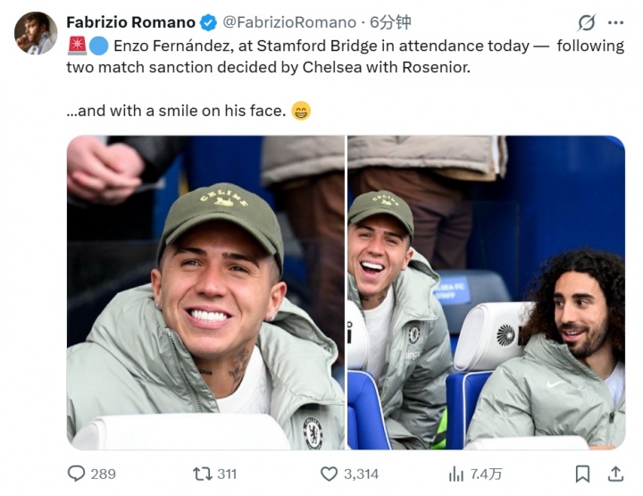 你是懂拱火的!罗马诺:被禁赛的恩佐来看球....还面带笑容😁